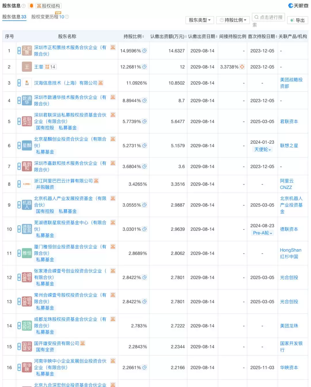 在外部股东中,美团战略投资部通过汉海信息技术(上海)有限公司持有11.0926%的股份,为第一大外部股东;美团龙珠通过相关基金持股2.783%。阿里云CNZZ通过浙江阿里巴巴云计算有限公司持股3.4265%。至于字节跳动和小米在本轮B轮融资后的具体持股比例,尚未体现在当前公开的股权结构中。