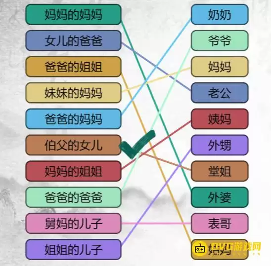 以“妈妈的妈妈叫外婆”这一典型关系为基准,可以推导出其他所有配对。本关卡实质上是对中文亲属称谓系统的一次互动式测验,掌握直系与旁系亲属的对应称呼即可轻松应对。