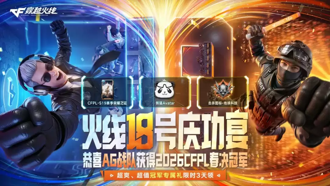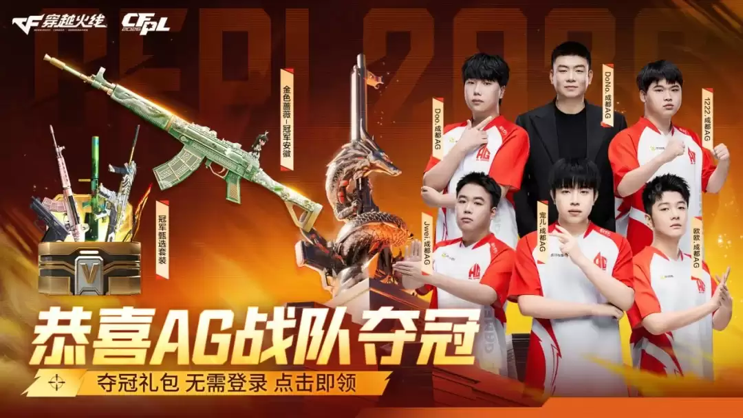 让我们再次恭喜成都AG战队夺得CFPLS27赛季总冠军!冠军的荣耀属于他们,丰厚的福利也属于所有CFer。点击下方阅读原文进入活动页面,即可领取冠军臻选套装、金色蔷薇-冠军安徽等精美道具。此外,冠军之师成都AG将大摆3天庆功宴,参与“火线18号庆功宴”活动,还能领取CFPL-S19赛季荣耀之证,更有熊猫A vatar、击杀图标-地球科技等好礼倾情相赠。如此丰厚的奖励,怎能错过?赶快行动起来,参与活动,把冠军同款奖励带回家吧!