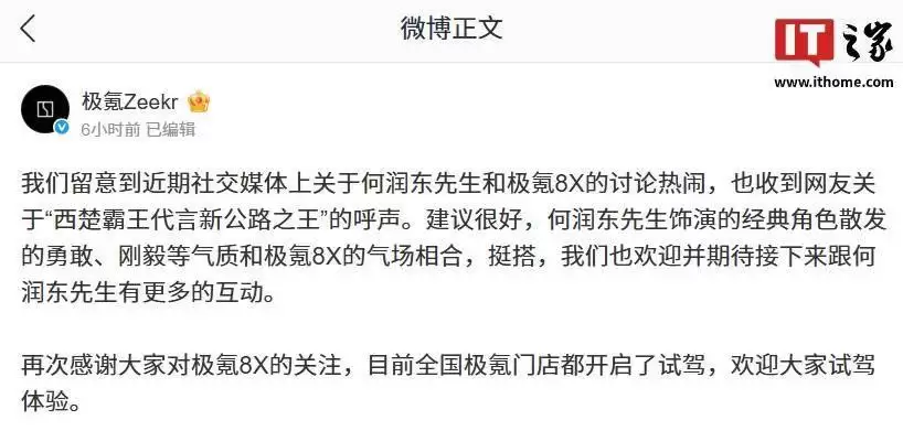 这一文化现象迅速跨界发酵至汽车领域。社交平台上,“邀西楚霸王代言新公路之王”的创意构想获得大量网友附议。极氪汽车对此反应迅速,官方回应称已关注到网友将何润东的硬汉形象与极氪8X车型进行关联的洞察。品牌方认为,其经典角色所承载的勇毅魄力与新车希望传递的核心气场存在高度共鸣,并公开表达了与这位演员探讨合作的可能。借此契机,极氪同步宣布全国展厅试驾服务全面开放,邀请用户亲身体验产品实力。