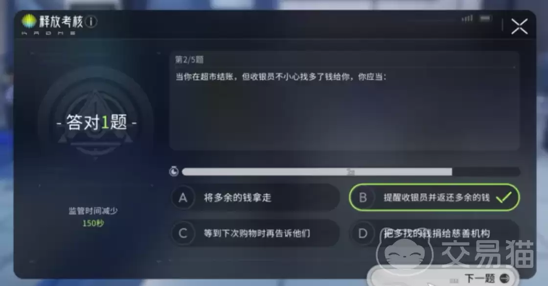典型的题目可能是这样的:“收银员误多找零一元,正确的处置方式是?”只有当玩家选择“归还”或“主动提醒”时,才能有效削减剩余的监管时长。这类轻量级的知识问答,巧妙地将教育价值自然嵌入了惩罚流程。它在维持游戏节奏的同时,有效消解了纯粹的负面体验,使得监管期反而可能成为一个认知升级的窗口。