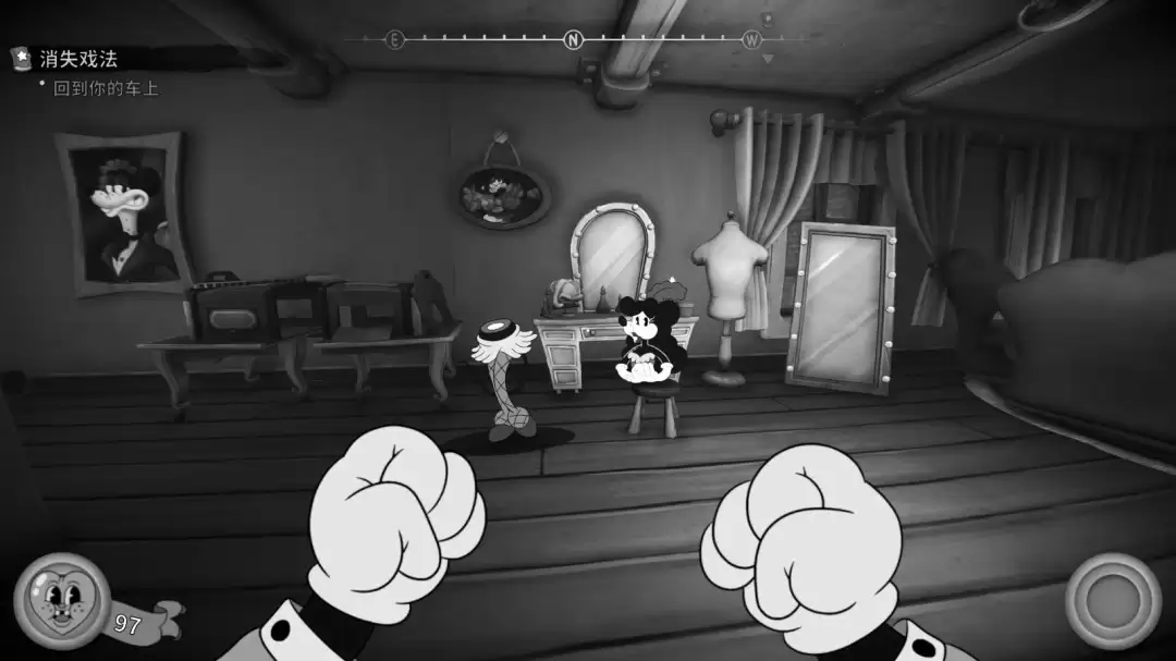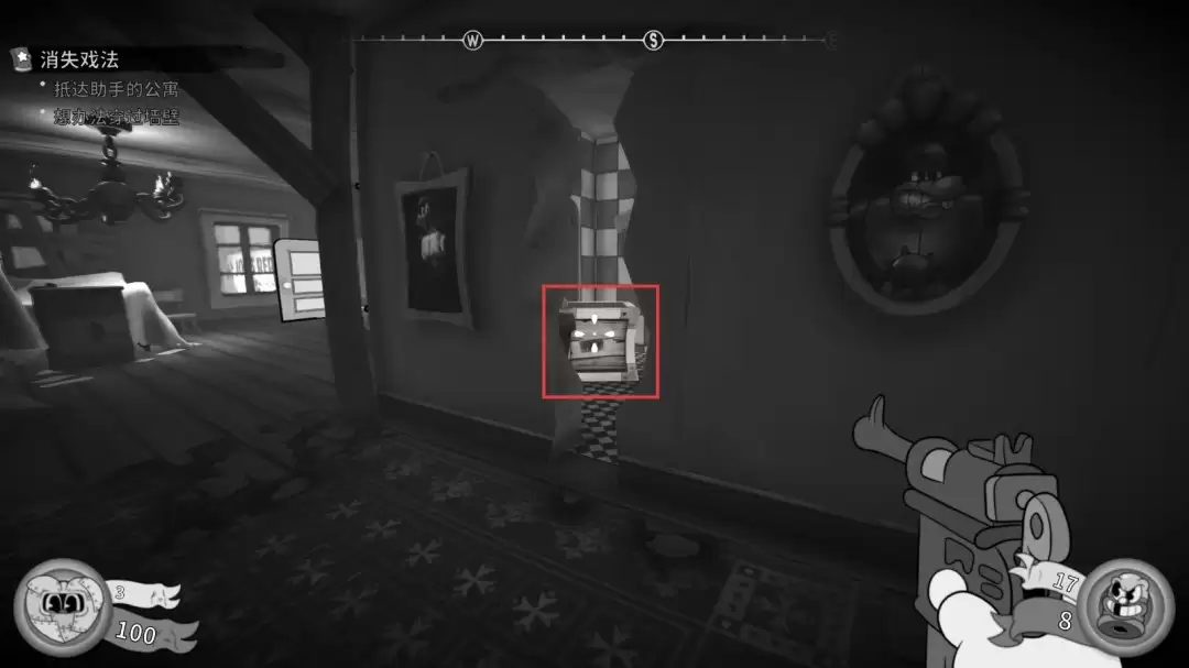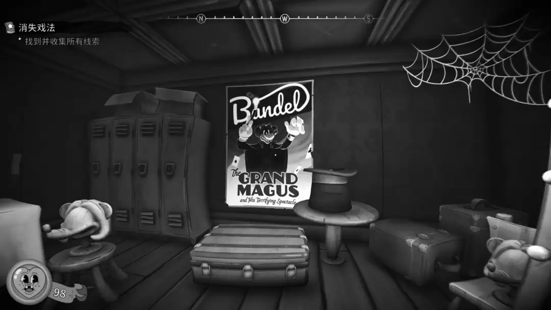 接下来,想办法进入演员的休息室。进去之后,右侧的墙壁上贴着一张显眼的海报,那就是关于失踪魔术师班德尔的第一条线索。