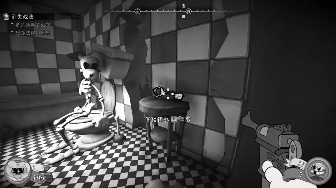 这个需要点技巧。先找到一处墙缝,射爆后面藏着的木箱。然后,去厕所拿到一把关键的钥匙。用这把钥匙打开阁楼的门,工作台上就是你寻找的蓝图。