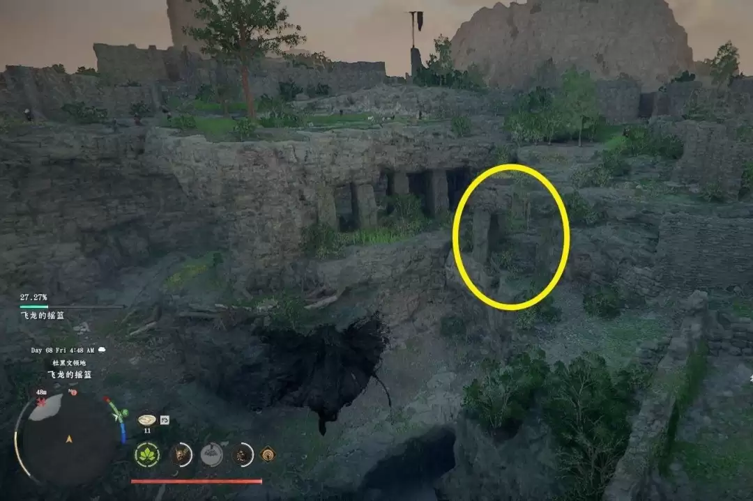 这里分享一个亲测有效的路线:先爬到附近的“飞龙的摇篮”据点,找到那座瞭望塔。从塔上往下飞的时候,注意观察下方地形。你会看到一个下层有许多石柱耸立的平台,目标就在那儿。请认准下图这个场景: