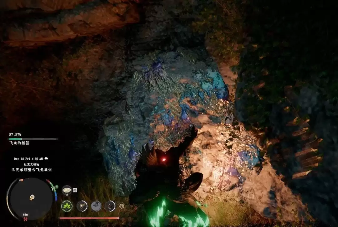 落地后,找到右侧的石柱,后面藏着一条通道入口。顺着通道走到尽头,会发现一面看起来不太结实的石墙。这时候,就需要用到“凝神劲法”(键盘操作是X键+鼠标中键,手柄则是L3+R3+R3)来击碎它。