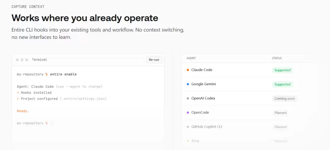 目前,Entire CLI已支持Anthropic的Claude Code和Google Gemini CLI,且支持多智能体并发对话。Entire明确承诺将保持平台“开放、可扩展且独立”,支持所有智能体和模型。这一战略直指当前AI编程工具可能被少数巨头锁定的行业担忧。