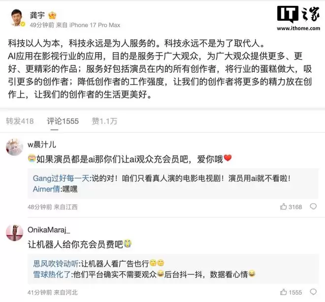 科技发展的浪潮中,总有一个核心命题被反复提及:技术究竟是替代人,还是服务人?近日,爱奇艺创始人龚宇的一番表态,为这个问题提供了一个来自影视行业的清晰注脚。