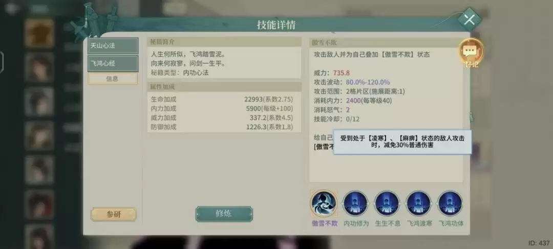自带的辅修心法"傲雪不欺"为1级被动,持续3回合。经过实测验证,该效果无法突破60%减伤上限——这个数值恰好是大多数侠客的满减伤阈值。