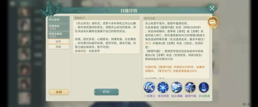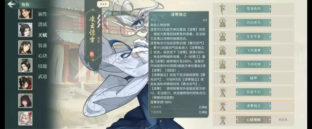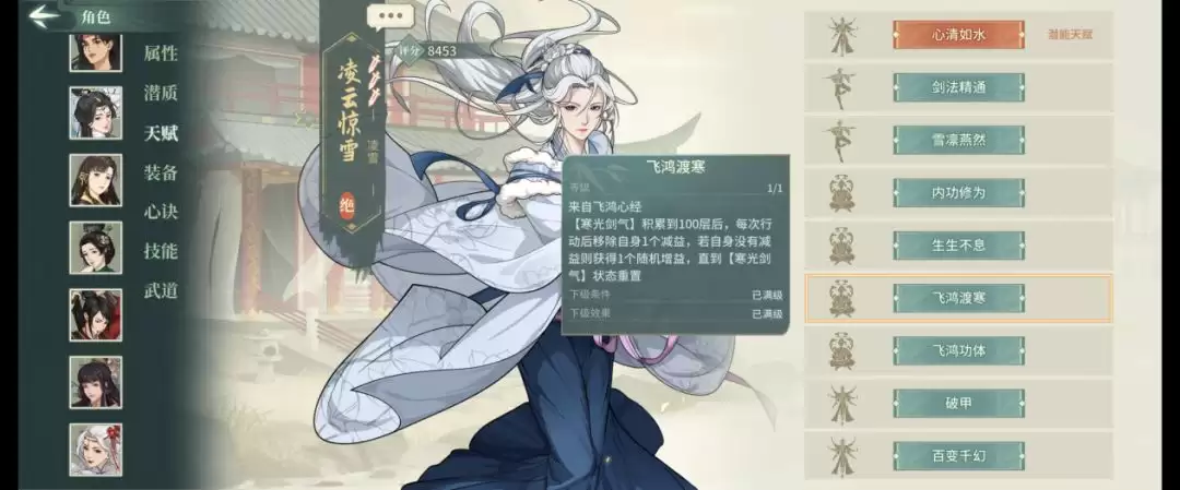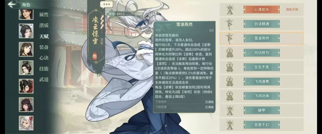 需要注意的是四技能"踏雪吟霜"具有开局冷却-1的特性,基础冷却12回合,消耗2点怒气。