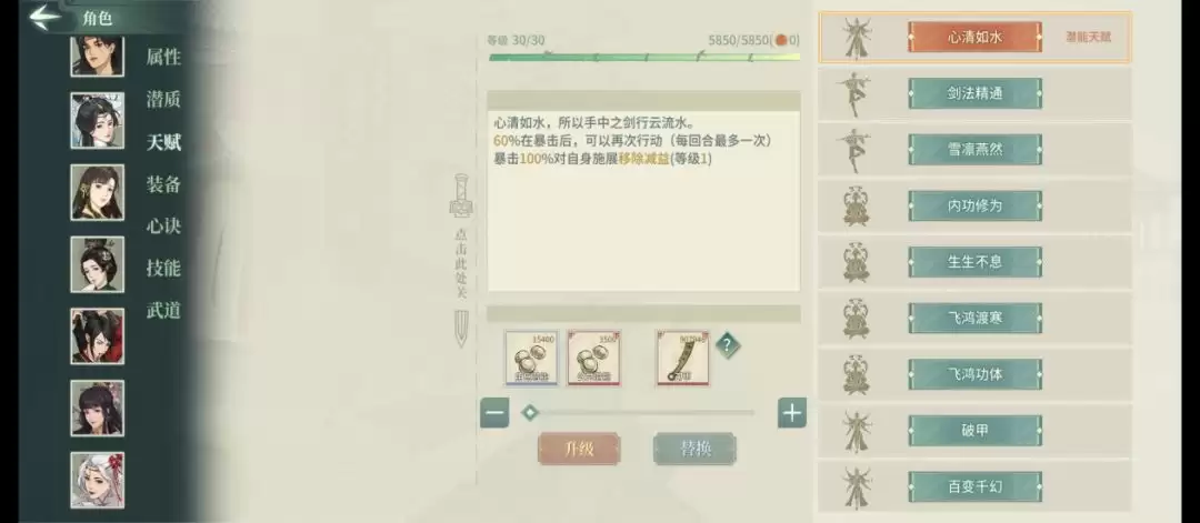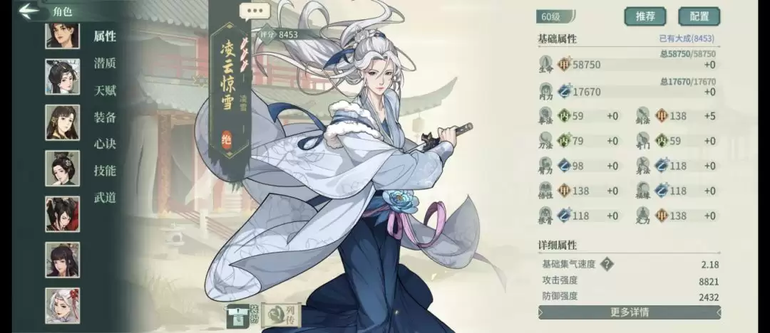 悟性与定力达到甲级138点——这个数值意味着既可走控制路线,也能搭配通神心诀将定力转化为输出资本。臂力乙级98点中规中矩,而身法、福源、根骨均为乙+118点,在当前以压阵角和肉盾角为主流的环境下略显不足。值得欣慰的是生命值达到甲+级别,内力虽只有乙+但配合生生不息特性,续航能力完全足够。