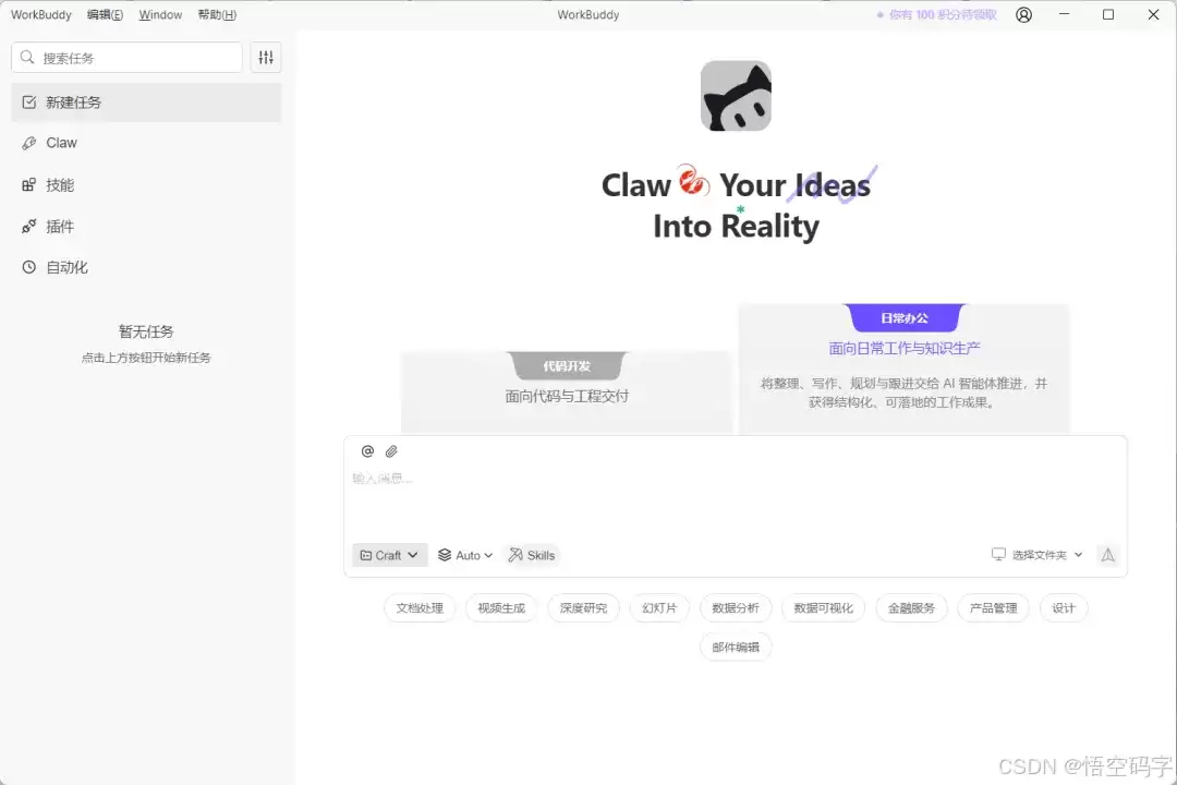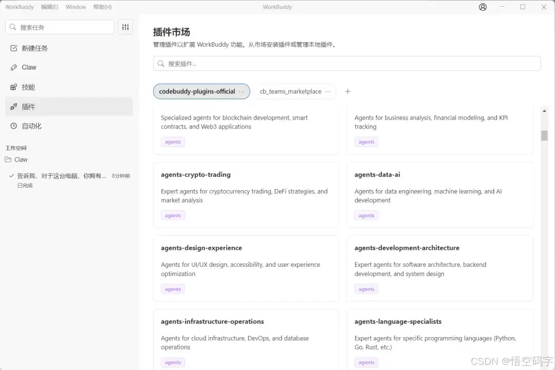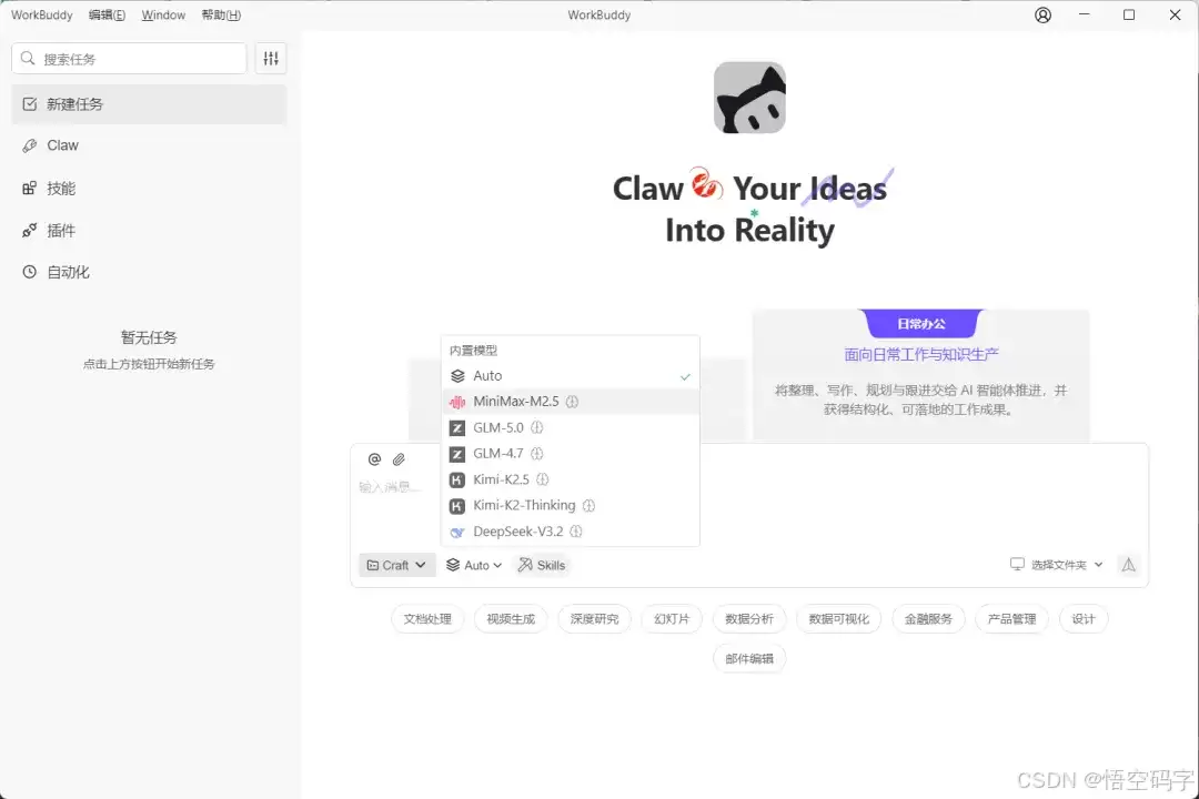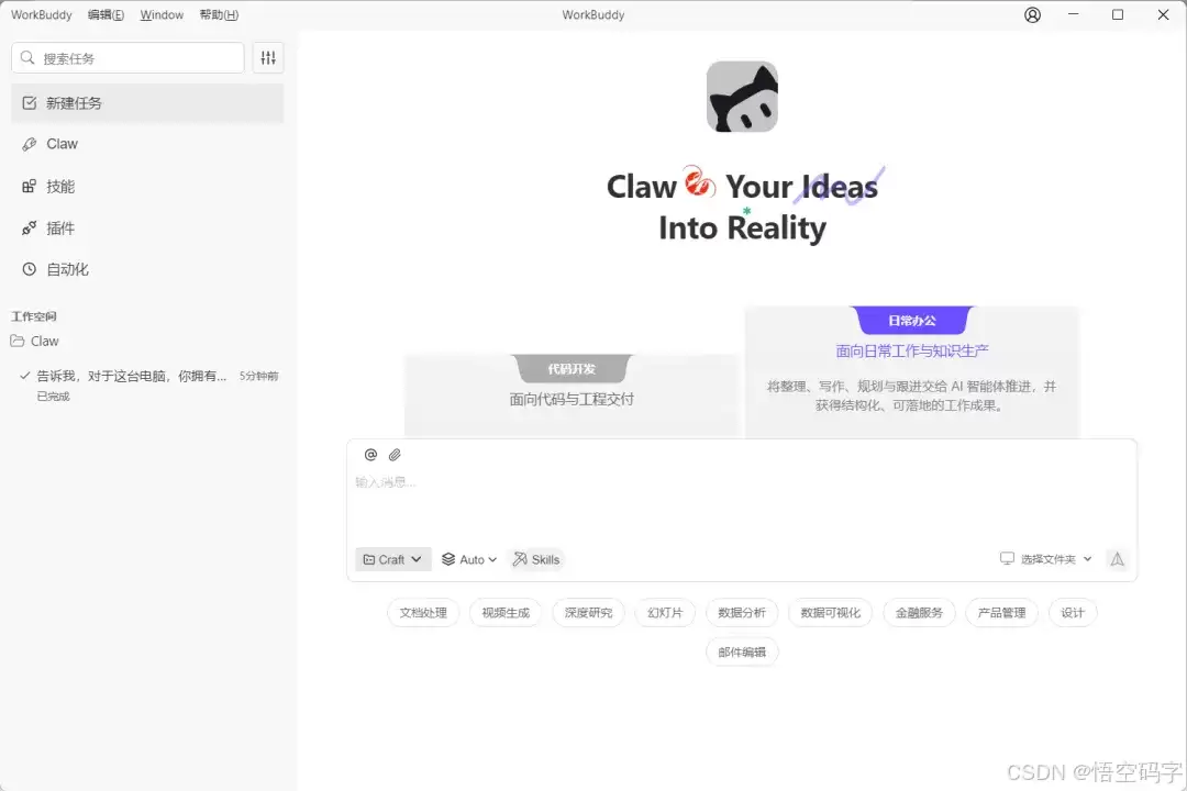 观察WorkBuddy的操作面板,可以发现其功能划分为五大模块:新建任务、Claw、技能、插件和自动化。