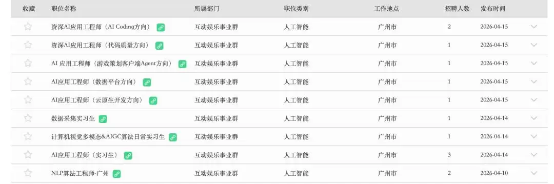 最直观的感受,是AI岗位的扩张势头。在统计的7300个岗位中,AI相关职位占比已接近15%,数量达到1076个。考虑到样本均来自腾讯、网易、米哈游等头部厂商,且部分岗位描述可能存在更新滞后,行业对AI人才的实际渴求度,恐怕比数据显示的还要强烈。