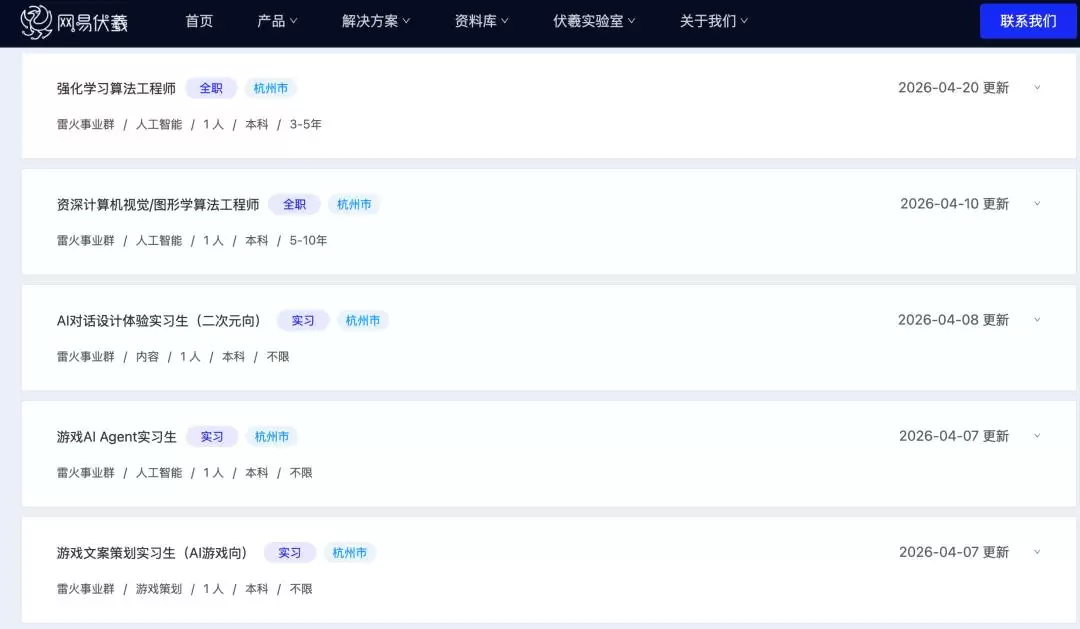 网易的打法则显得更为聚焦。它是少数将“人工智能”单独设为招聘大类的厂商,旗下专攻AI技术的伏羲实验室也拥有独立的招聘专场。数据显示,网易对AI人才的需求以原生岗位为主,在169个AI相关岗位中,原生岗比例高达63%。