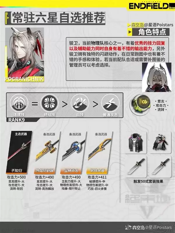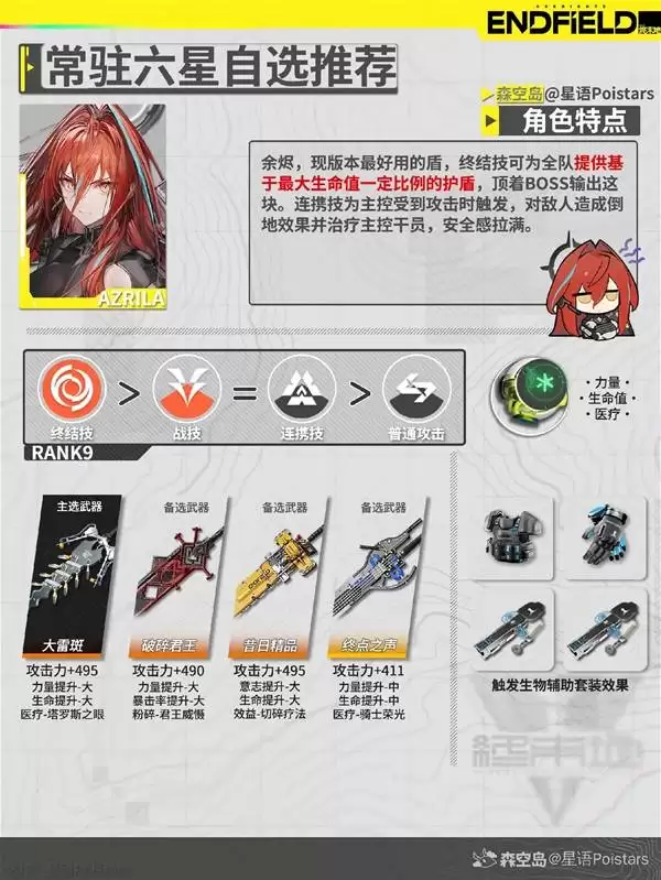 第三位,团队的坚实壁垒。选择他的武器,其实逻辑最简单直接:生存,生存,还是生存。高额的防御力和生命值加成是永不犯错的选择。我个人在开荒高压图时,曾给他配备过一把提供“受到治疗加成”的武器,配合医疗干员,那个坦度真的让人安心。但这里值得一提的是,有些武器会提供“仇恨值提升”或“受击回复能量”的词条,这对于需要稳定吸收火力的他来说,有时候比单纯堆防御更有战略意义。