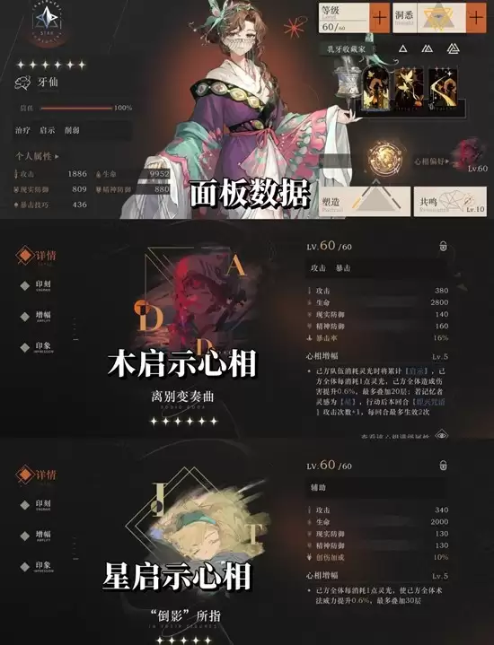 心相推荐是提升的关键一步。木启示队我首推「离别变奏曲」,而星启示队则更契合「倒影所指」。这两件心相都值得你投资,尽量养到满级满增幅,对队伍的输出提升是肉眼可见的。(其他角色的专属推荐心相,大家可以参考攻略封面图,这里不赘述了。)