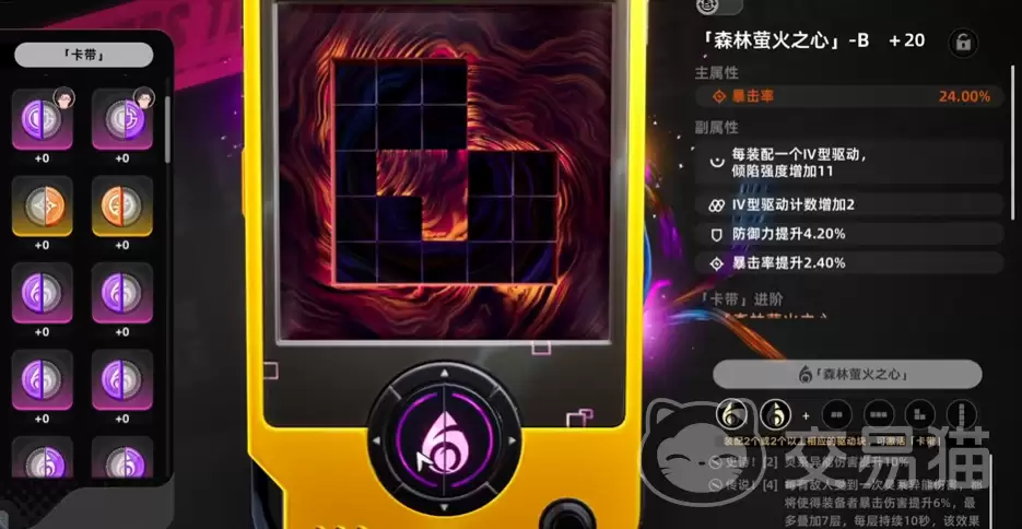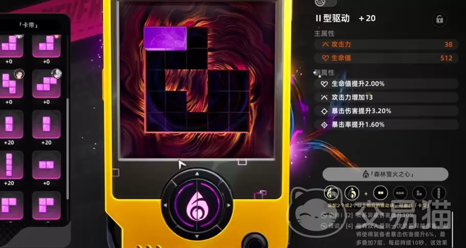 成功配对卡带只是打开了大门。接下来,注意力要转移到界面右下角那个类似俄罗斯方块的网格区域。除了左右卡带,你还需要在这里嵌入四个“驱动块”——也就是空幕的上半区域组件。驱动块怎么放?可不能随心所欲。它们的种类、数量乃至摆放位置,都必须严格符合当前卡带所要求的套装条件。只有当驱动块的配置完全达标,右下角的套装标识才会从灰色变为可交互状态,这标志着套装效果被成功“点亮”。