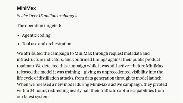 如果把时间线拉回到今年2月,这场冲突的序幕就已经拉开。当时,Anthropic发布了一份详细的调查报告,直接点名了DeepSeek、月之暗面和MiniMax这三家公司。报告指控它们创建了约2.4万个欺诈账户,与自家的Claude模型进行了超过1600万次交互,并将获取的“精华”数据用于训练自家模型。