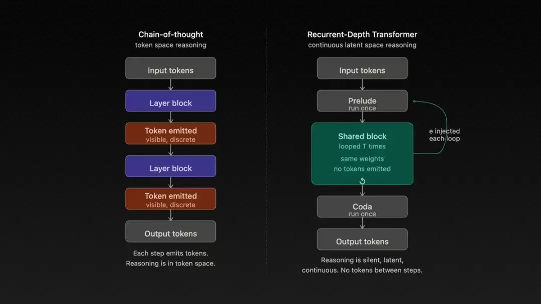 这与我们熟悉的思维链推理完全不同。思维链是“想一步,写一步,再想一步”,中间过程全部暴露。而循环深度Transformer是“内部反复琢磨16遍,最后才说一句话”,整个推理过程完全内化。
