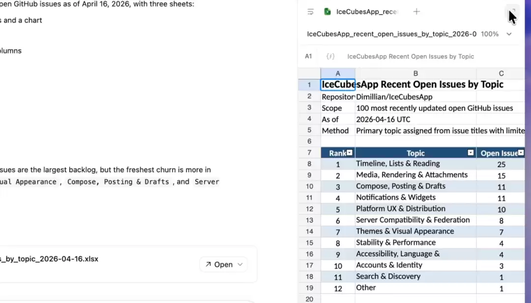 侧边栏功能也变得极其强大。PDF文件、电子表格、幻灯片和文本文档,现在都能以富文本形式直接预览。举个例子,Codex可以把GitHub issue按主题分类导出成Excel表格,并在侧栏直接预览,信息梳理一目了然。