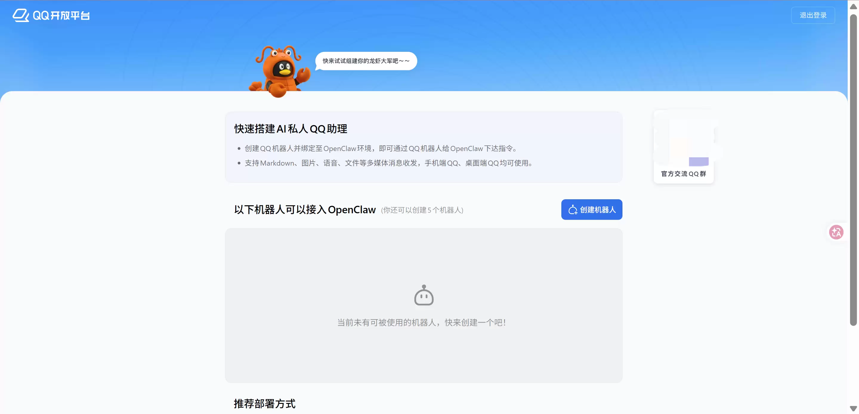 点击「创建机器人」点击创建机器人。