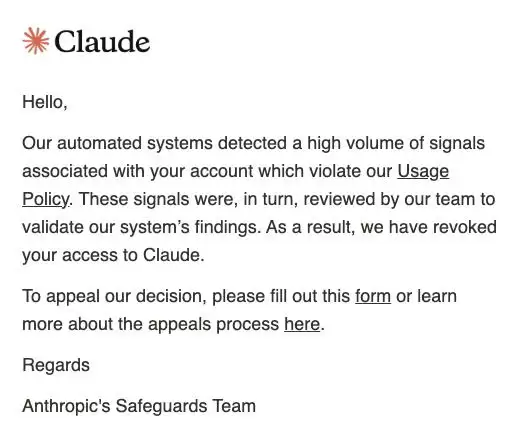 没有预警,没有电话,只有一封冰冷的邮件躺在那里:“检测到违反使用政策的自动化信号,您的账号已被暂停”。
