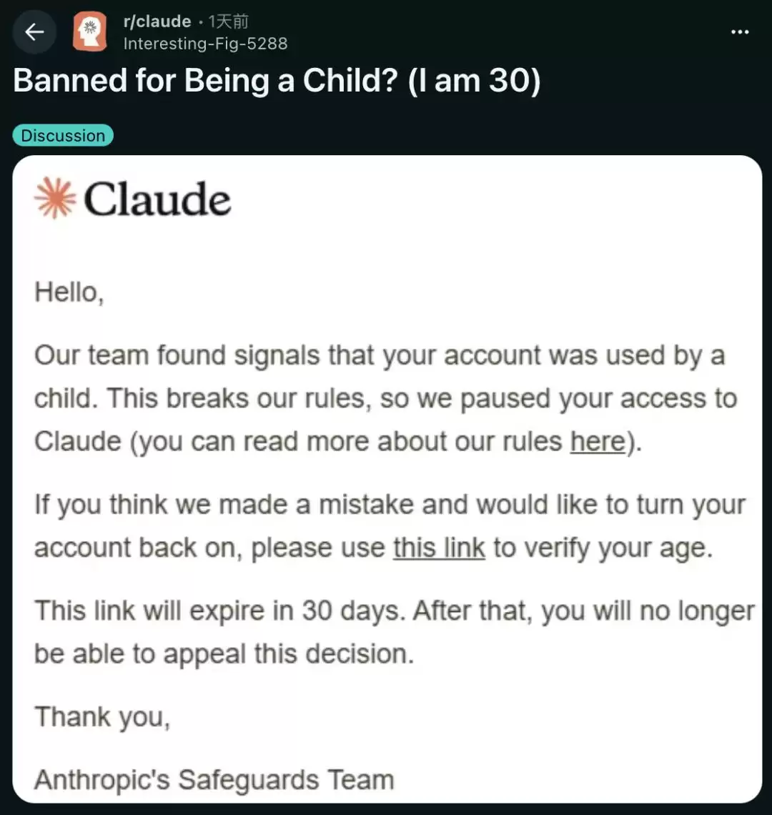 而就在本周,多名用户在Reddit和X上报告,自己的Claude付费账号被错误地标记为“未成年人”而遭到封禁。一个成年人,支付着Pro版的费用,却被AI系统判定为小孩然后踢出门外——这种荒诞程度,恐怕连《黑镜》的编剧都不敢这么写。