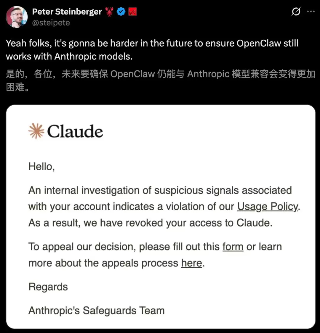 就在一周前,OpenClaw之父Peter Steinberger发帖称,自己的Claude账号因“可疑活动”被封。