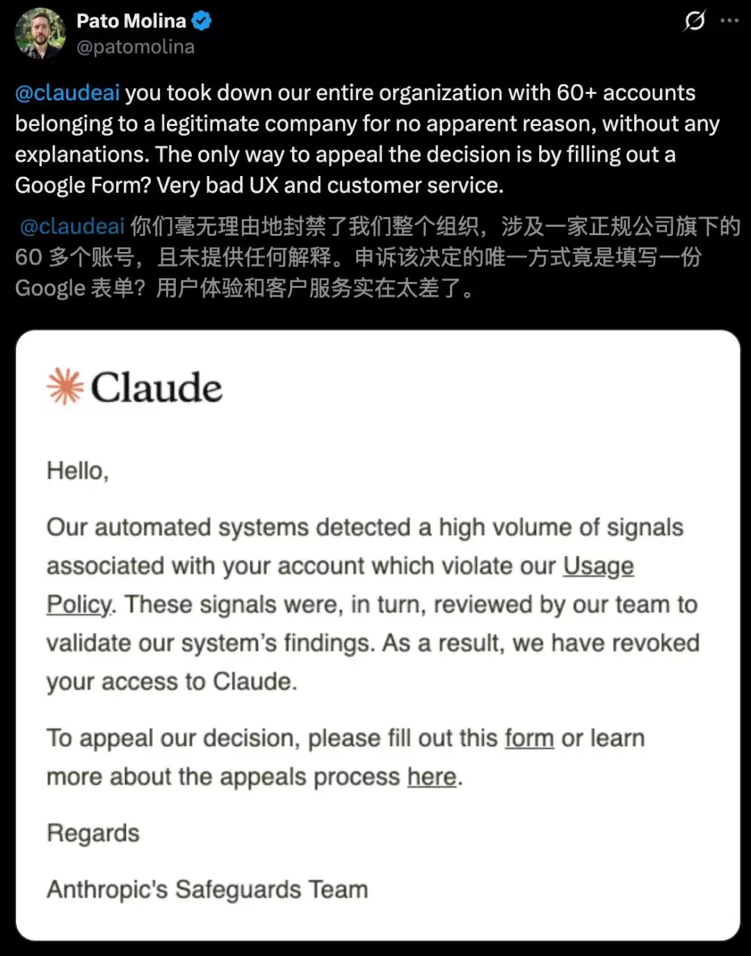 后果是灾难性的:所有的对话历史瞬间清零,所有的集成工具集体瘫痪,所有基于Claude构建的自动化工作流,一夜归零。公司CTO Pato Molina在X上发出的那条帖子,瞬间震动了整个开发者圈:“你们毫无理由地封禁了我们整个组织的60多个账号。没有任何解释。唯一的申诉方式是填一个Google表单?这是什么客户服务?”