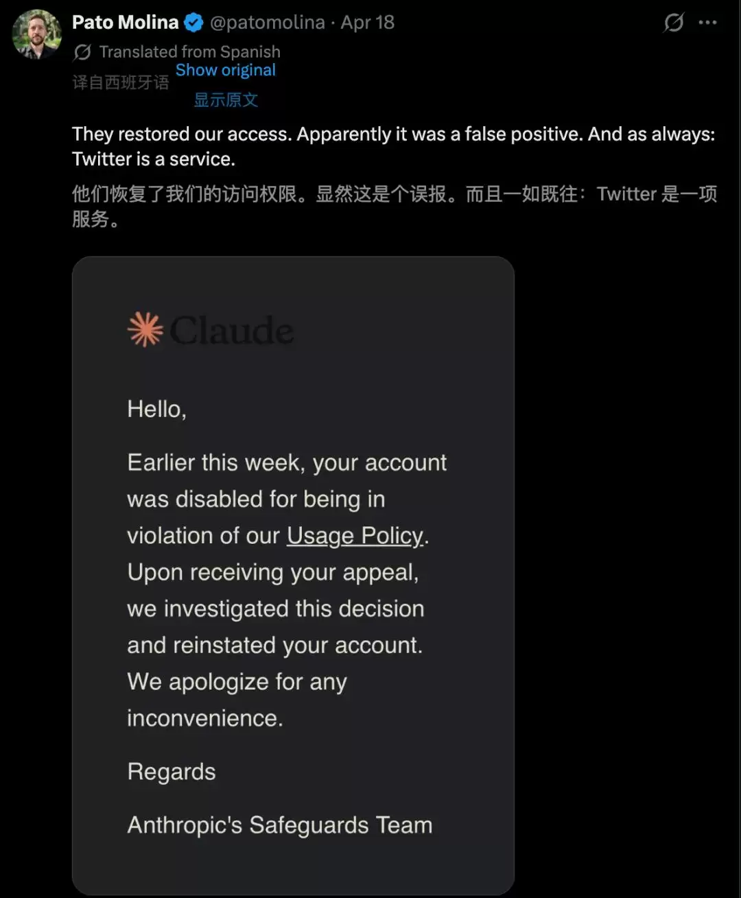 Anthropic“安全团队”的复函,最终姗姗来迟。邮件内容简洁得近乎冷酷:“您的账号因违反使用政策被禁用。收到您的申诉后,经调查,已恢复。对造成的不便表示歉意。”