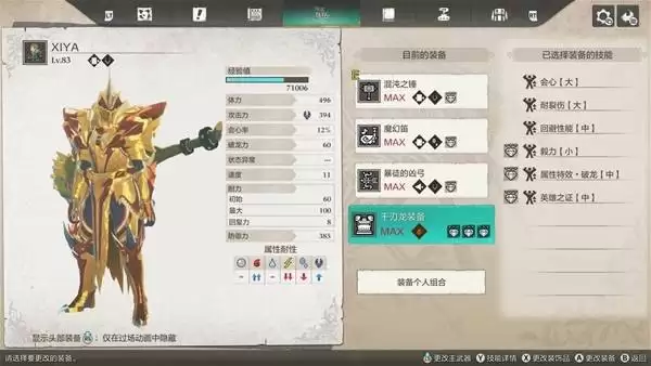 • 防具:升满的千刃龙套装。镶嵌的珠子推荐“毅力”、“属性特效【破龙】”,第三个孔位可以自由发挥。