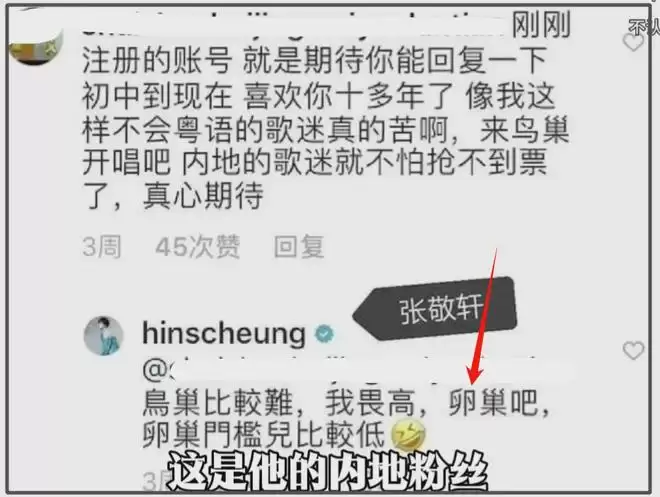 更何况,他的问题远不止立场层面。在对待粉丝和女性方面,其言论也备受诟病。早年,一位喜欢他十多年的内地粉丝曾留言,热情欢迎他来国家体育场(鸟巢)开唱,说这样内地歌迷就不用辛苦抢票了。你猜张敬轩是怎么回复的?他竟然说:“鸟巢比较难,我畏高,卵巢吧,卵巢门槛比较低。”这像一个公众人物、一位偶像该说的话吗?
