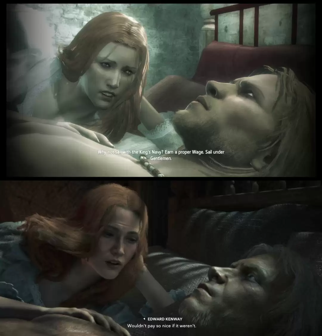 Reddit用户ZamnBoii最新分享了一张据称是《刺客信条:黑旗》重制版的实机宣传图。这张截图源自一段关键过场动画,并与原版相同场景进行了直接对比,呈现了主角爱德华·肯维与妻子卡罗琳在卧室中的经典叙事片段。