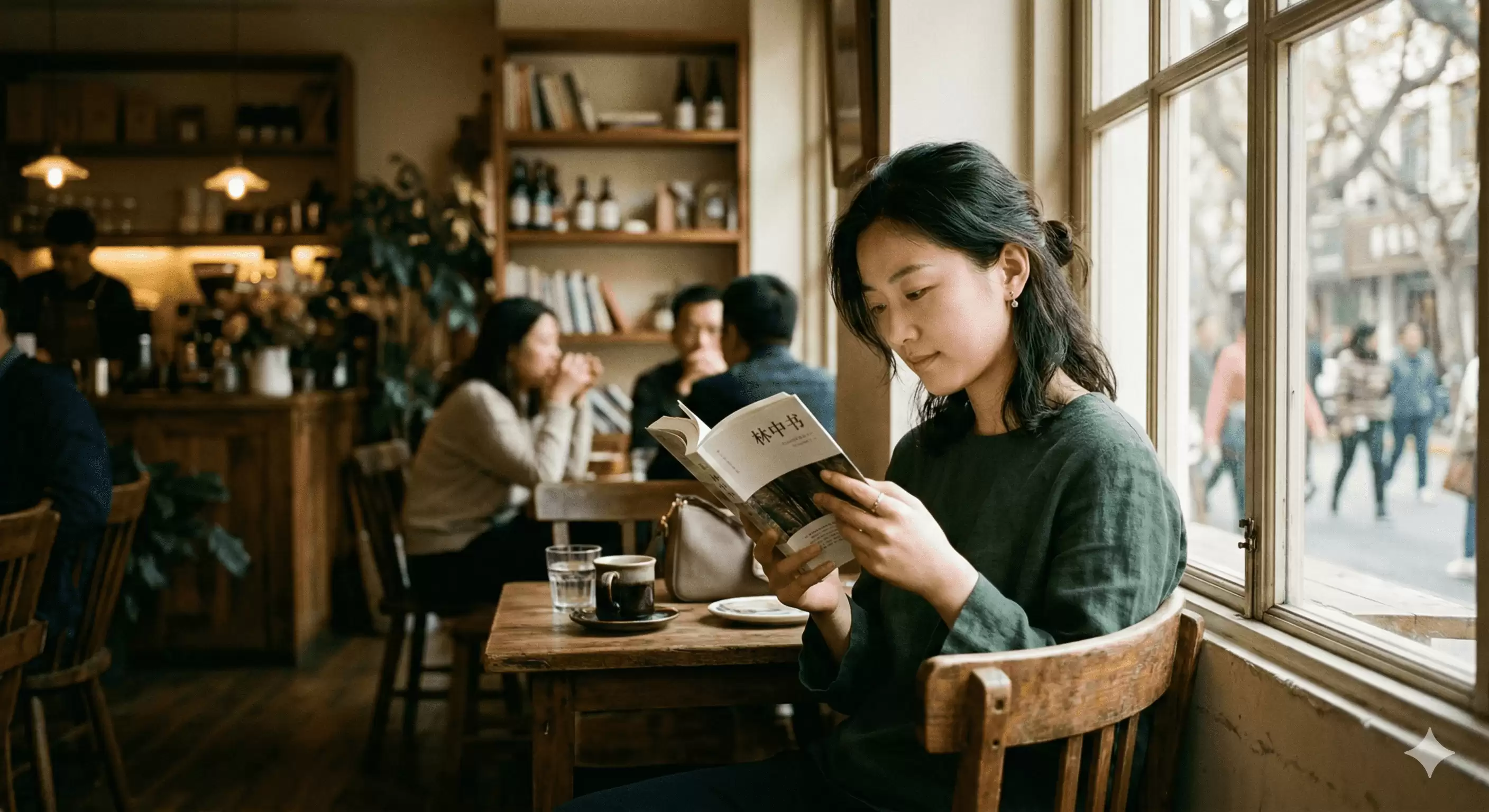提示词:一位年轻女性在咖啡馆窗边看书,自然光,电影感,写实摄影风格。
