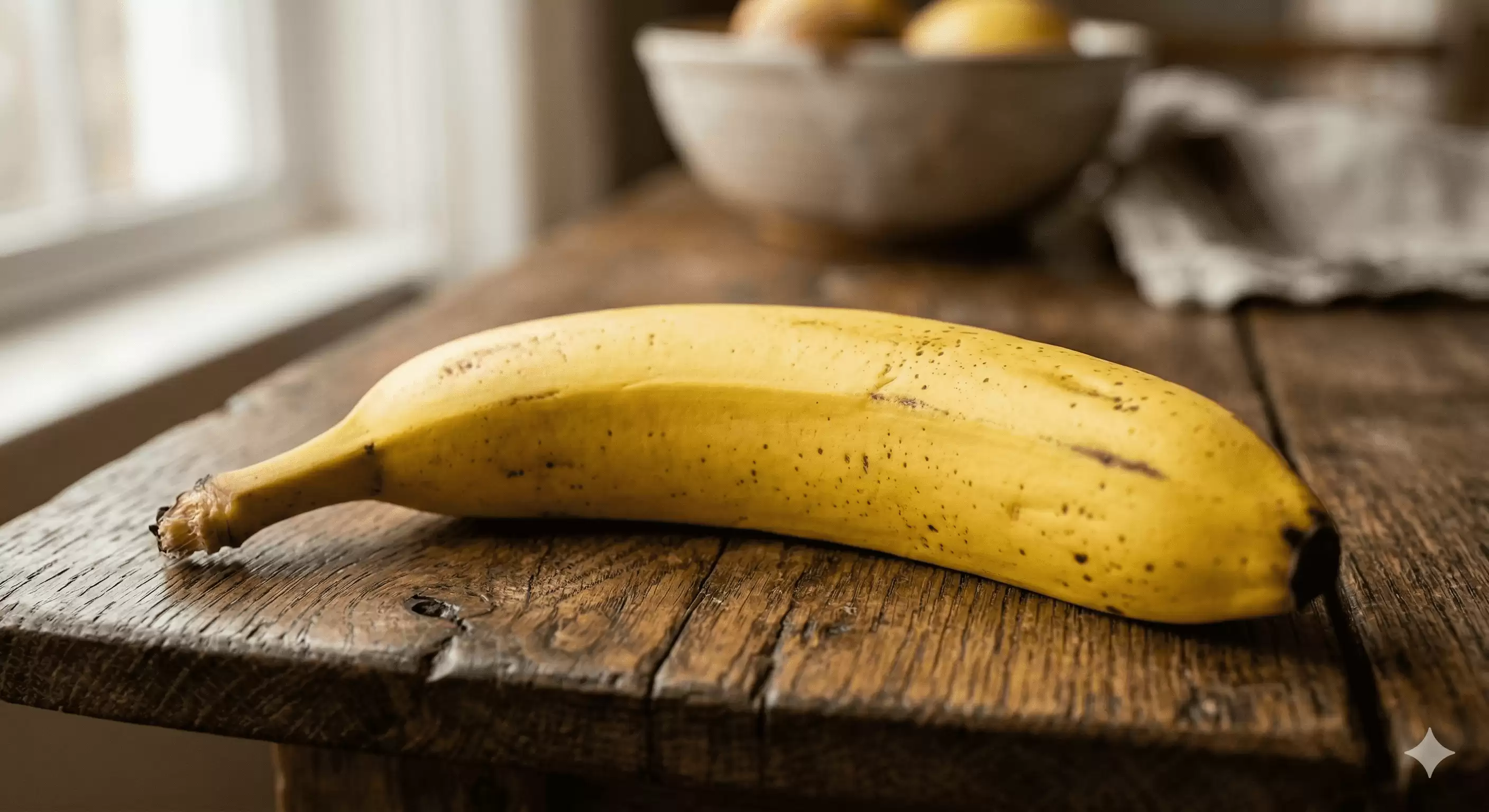 这张图堪称产品摄影的样板。香蕉表皮的自然斑点、蜡质的光泽感、尾端枯茎的细节,都被极其真实地还原出来。从侧面照射的窗体光形成了柔和的阴影,让物体的立体感和质感更上一层楼。如果不事先说明,它完全可以作为商业食品广告的素材使用。