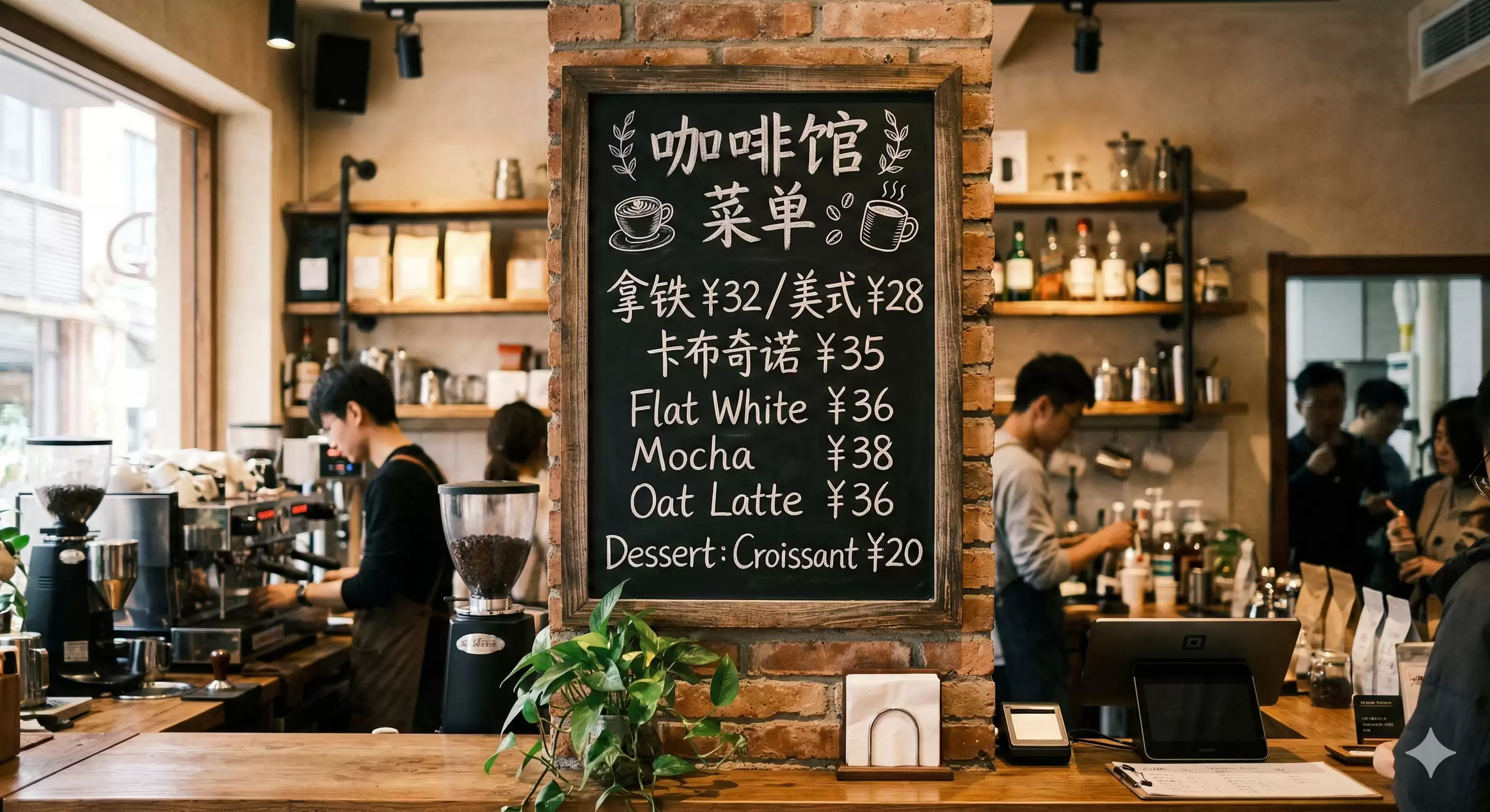 这张图的挑战更大。它要求模型在同一场景中,准确处理中文、英文、数字和货币符号,并将其自然融入一个高度写实的咖啡店环境。最终生成的结果令人信服:所有文字信息准确无误,黑板粉笔的手写风格流畅自然。背景中的人物、咖啡设备、环境光线都达到了以假乱真的程度,几乎难以分辨这是 AI 生成还是实景拍摄。