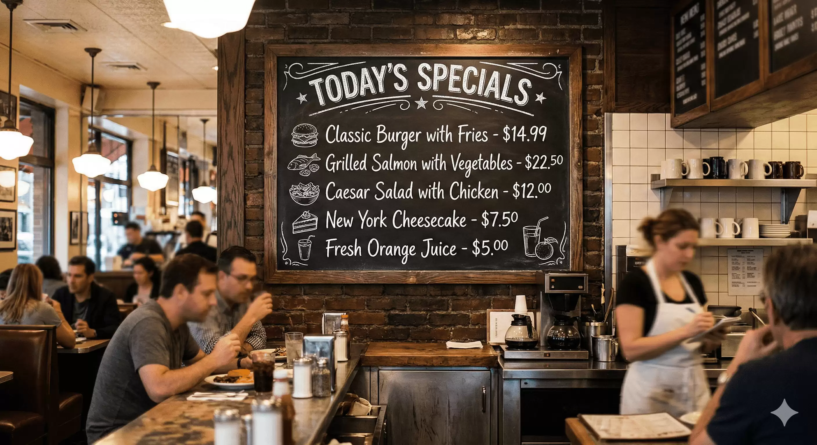 提示词:A chalkboard menu at a New York diner with handwritten text: “TODAY‘S SPECIALS” “Classic Burger with Fries - $14.99” “Grilled Salmon with Vegetables - $22.50” “Caesar Salad with Chicken - $12.00” “New York Cheesecake - $7.50” “Fresh Orange Juice - $5.00” Realistic diner atmosphere, warm lighting