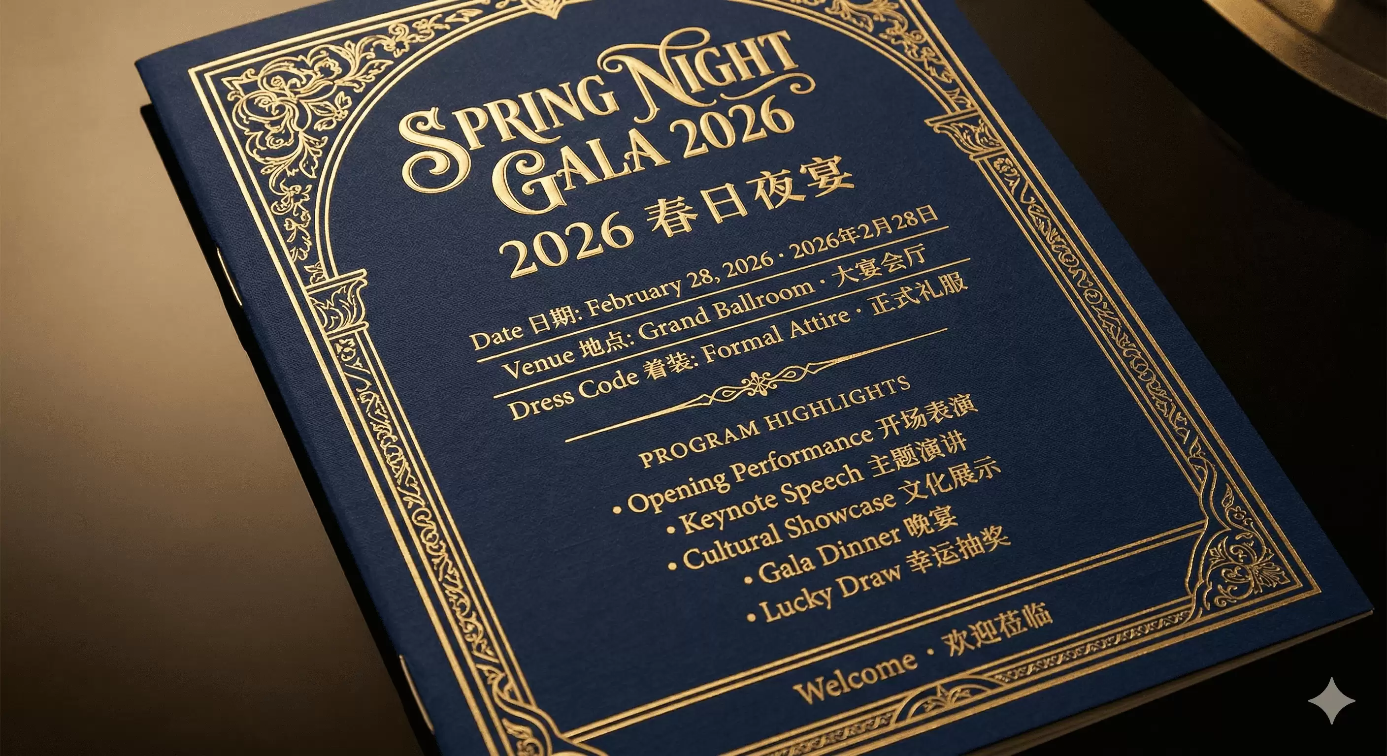 提示词:A bilingual event program booklet cover with the following text: English title: “SPRING NIGHT GALA 2026” Chinese title: “2026 春日夜宴” Event details in both languages: “Date 日期: February 28, 2026 · 2026年2月28日” “Venue 地点: Grand Ballroom · 大宴会厅” “Dress Code 着装: Formal Attire · 正式礼服” Program highlights: “Opening Performance 开场表演” “Keynote Speech 主题演讲” “Cultural Showcase 文化展示” “Gala Dinner 晚宴” “Lucky Draw 幸运抽奖” Footer: “Welcome · 欢迎莅临” Elegant design, gold and deep na vy color scheme, luxury event style