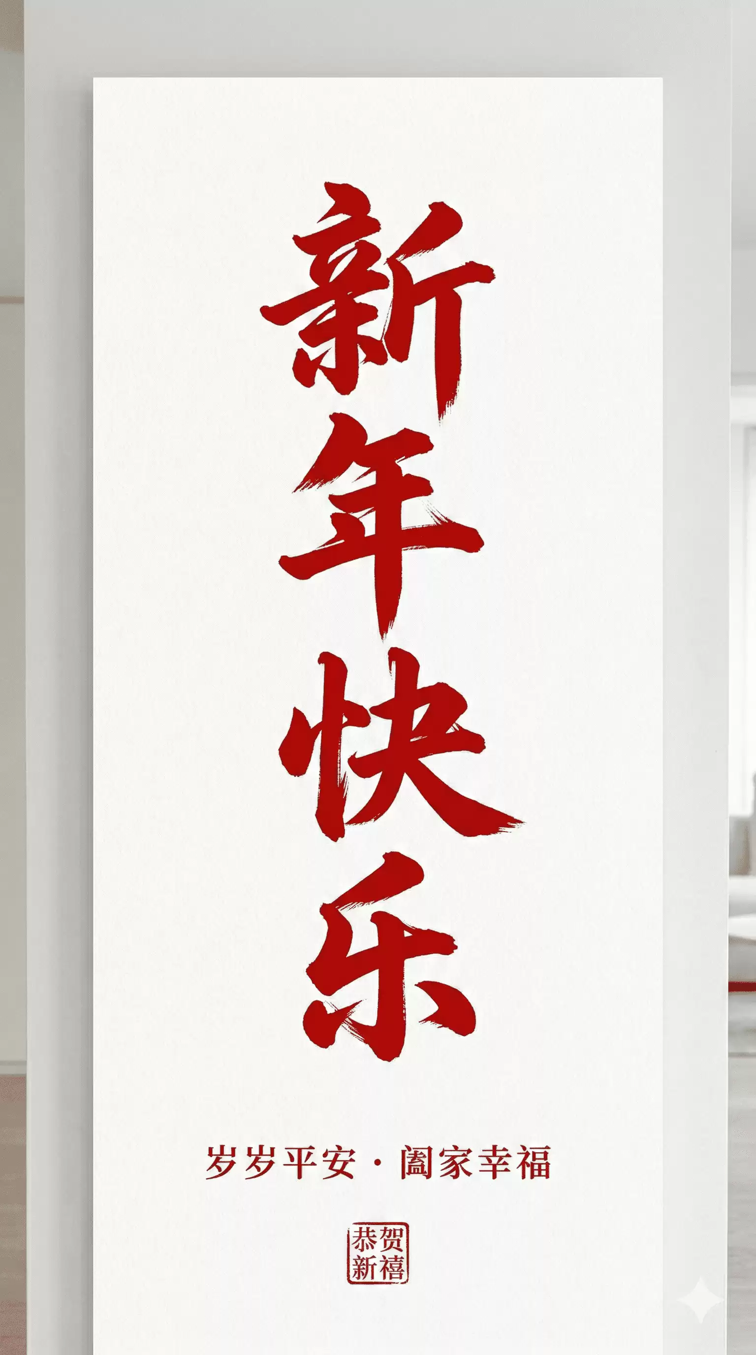 提示词:一张简洁的中文海报,白色背景,正中央写着“新年快乐”四个大字,红色毛笔字风格,字体饱满有力。