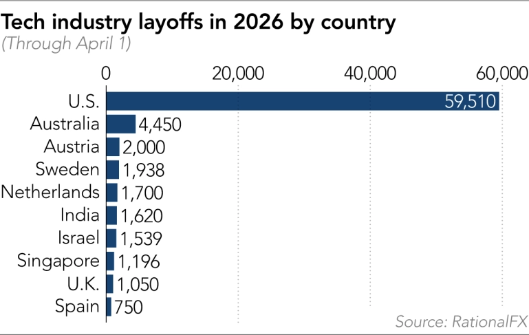 根据RationalFX的分析报告,从2026年1月1日到4月1日,全球科技行业累计裁减了78,557个职位。其中,美国市场成为了“重灾区”,贡献了高达76.7%的裁员比例。