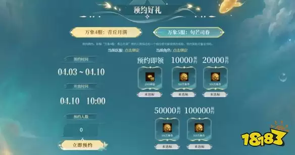 记住这个时间点:4月10日上午10:00,万象新服“青丘月满”与“句芒司春”将准时开启。而在4月3日至4月10日这段预约期内,提前行动绝对划算。新服预约人数每达成一个预设档位,所有预约玩家都能解锁一份对应的预约奖励。关键是,这些奖励可以叠加领取,只要预约热度够高,每位天命者最高可直接领取2000万象币!