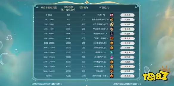 那么,如何界定“回归玩家”呢?很简单,账号超过30天未曾登录的玩家即符合条件。回归后,根据在万象服消耗的万象币和累计充值金币的档位,可以直接领取专属道具礼包,回归即享优待。