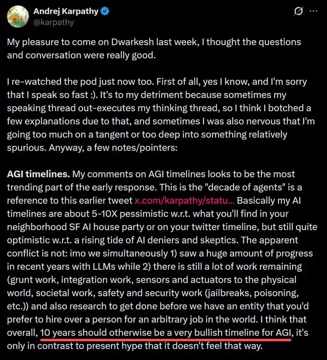 但同样有越来越多的研究者指出,从大型语言模型到真正的通用智能之间,存在着一道参数堆叠可能无法逾越的根本性鸿沟。前特斯拉AI高级总监、OpenAI联合创始人安德烈·卡帕西(Andrej Karpathy)就明确表示,AGI的实现仍需十年时间,远非某些行业领袖所宣称的那样“近在眼前”。