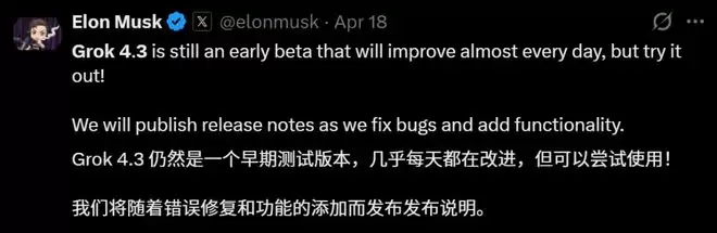 4月17日,xAI颇为低调地上线了Grok 4.3 Beta版本。注意,这次发布没有配套的官方博客,没有详细的技术白皮书,也没有第三方基准测试报告。这种“做了再说”的风格,确实很SpaceX。