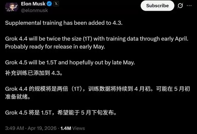 更令人震撼的,是他随之抛出的那份激进路线图:五月初,推出拥有1万亿参数的Grok 4.4;到了五月底,参数规模达1.5万亿的Grok 4.5将接踵而至。一个月内,连续发布两代万亿参数级别的模型,这种推进速度堪称史无前例。