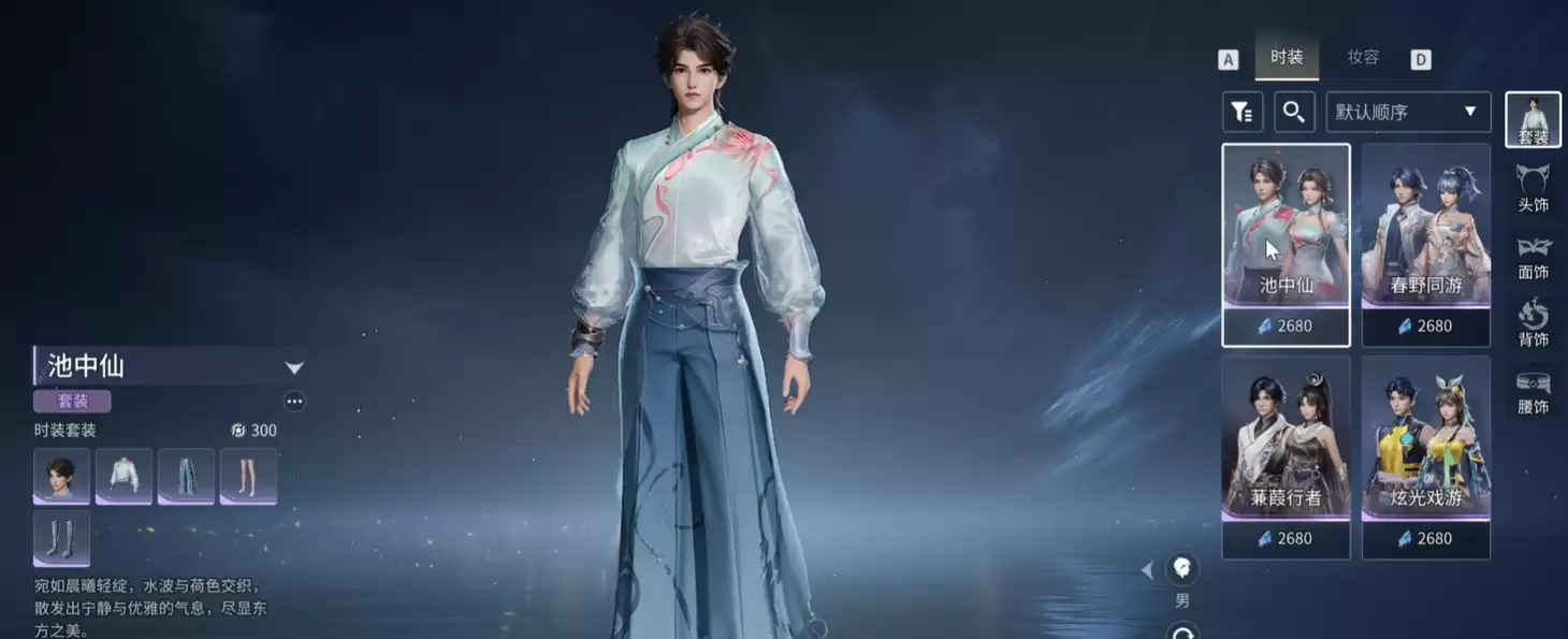 想找到“池中仙”其实很简单。打开游戏主界面,进入商城,再点开中间的“套装”分类,琳琅满目的时装就展现在眼前了。当然,这些精美装扮都需要通过游戏内购买获取。