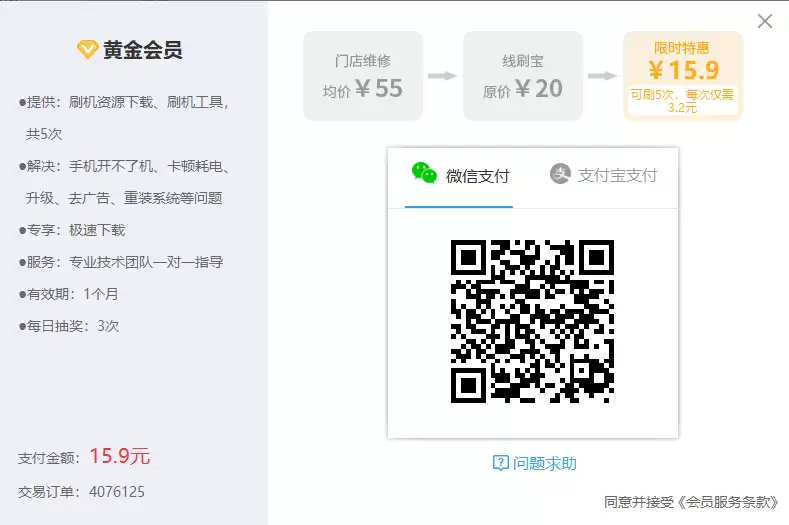 用手机扫码付款(支持微信/支付宝),购买对应特权的会员。成为会员后,在有效期内就可以无限制使用所有刷机资源了。