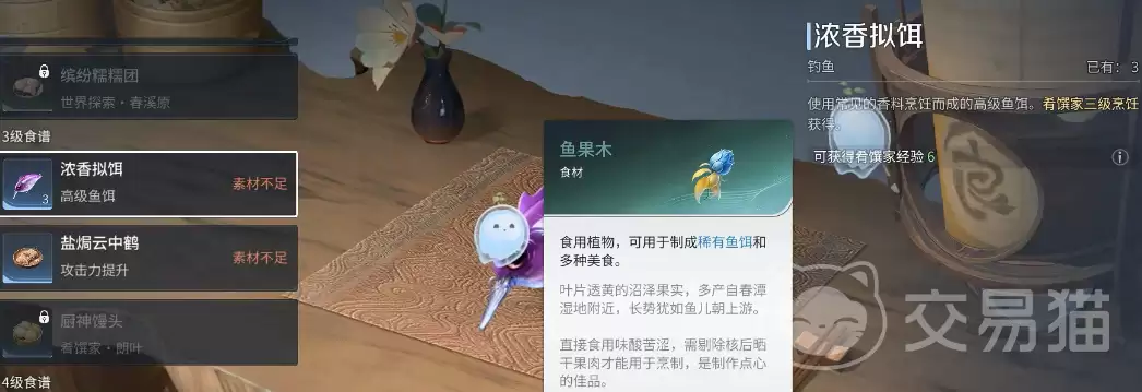 有了专业鱼竿,下一步就是配上对的饵料。经过大量玩家实测,“浓香拟饵”对褐斑龙鱼有着显著的吸引力,能大幅提升上钩率,堪称当前版本的最优解。这个拟饵需要在游戏里的烹饪台合成,原料是鱼果木和香料鱼粉。你看,把专业的装备和高效的饵料组合起来,才是优化操作、缩短等待周期的务实策略。