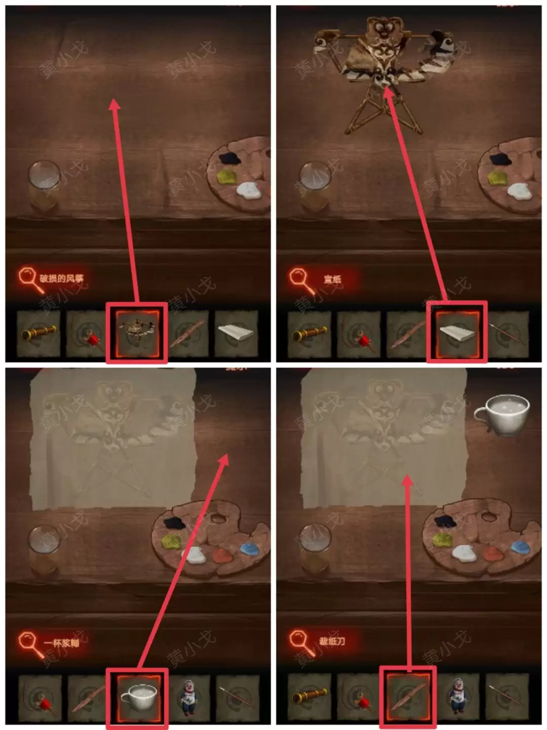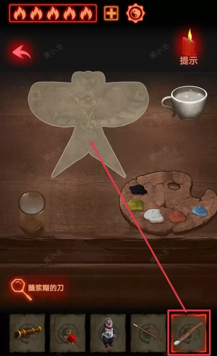 回到二楼右边房间,点击有画板的桌子。依次放上【破损的风筝】,盖上【宣纸】,再把【一杯浆糊】也放在桌子上。最后,使用【裁纸刀】裁剪宣纸。