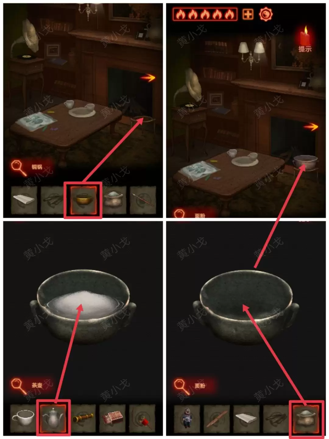 回到一楼房间。把【铜锅】放到架子上,然后依次倒入【面粉】和【茶壶】里的水。