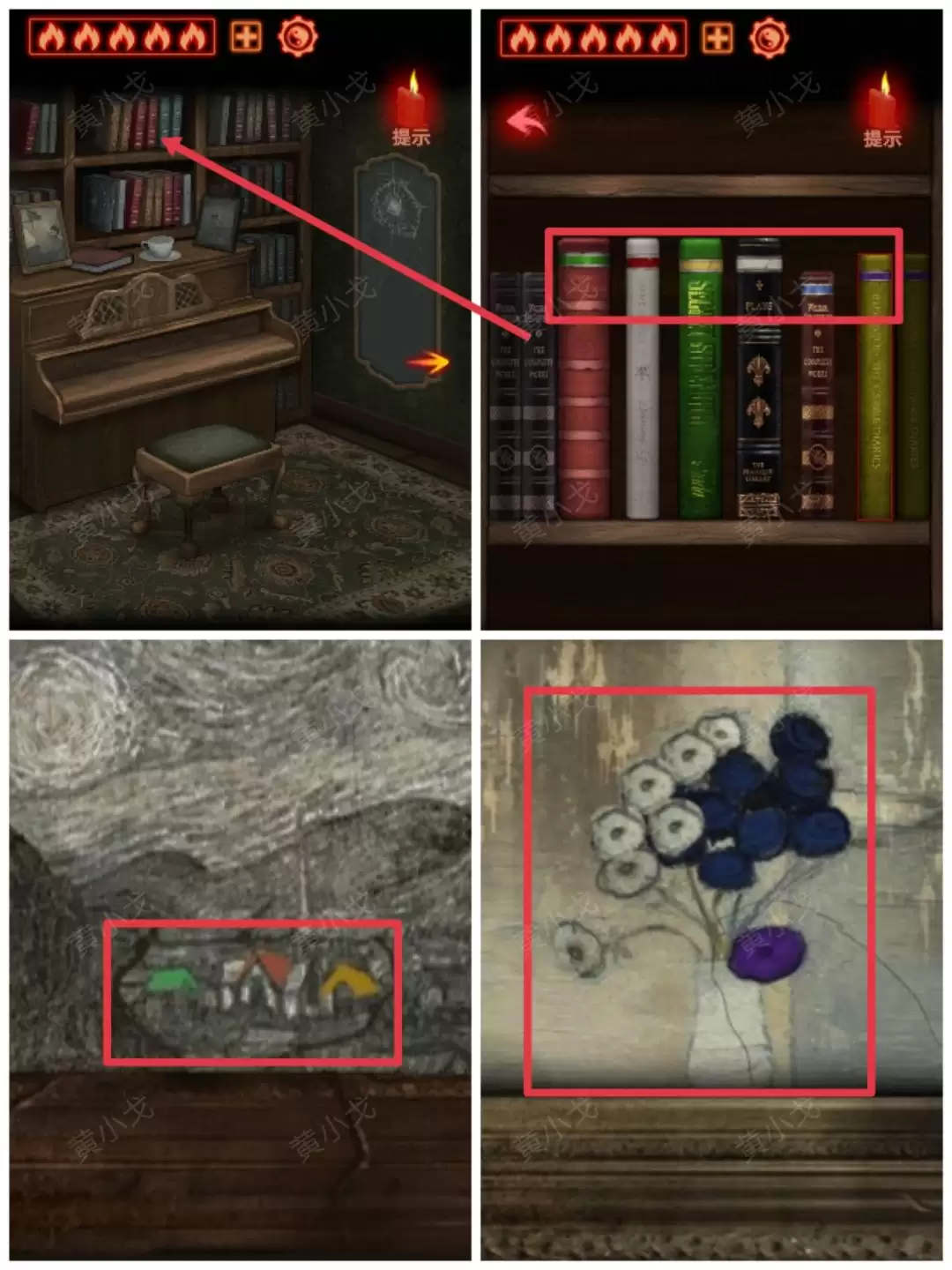 点击书架上的书。这里需要结合之前在楼梯口两幅画上看到的颜色顺序线索(绿、红、橙、紫、蓝、白),以及书签的颜色提示,来调整书的正确排列顺序。